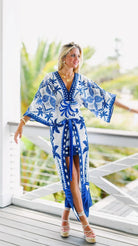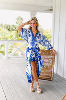 Discover a new favorite in the perfect wrap design that flatters every curve. This blue wrap dress is designed with an A-line silhouette and a V-neckline that adds a hint of sophistication to your look, making it ideal for any occasion. With its comfortable sleeves and midi length, it brings an easy flow to your step while keeping you stylishly cool on sunny days.