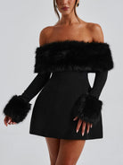 IMARA – OFF-SHOULDER FUR SLEEVE MINI DRESS – GLAMOROUS FLAIR WITH LUXURIOUS DETAILS